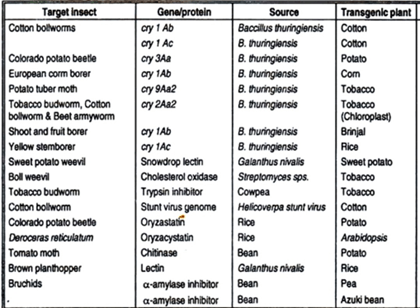 - Genes conferred with protease inhibitors, alpha amylases are introduced which interacts with insect metabolism and confers resistance by destroying it.