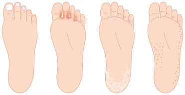 Symptoms: The symptoms of an athlete’s foot vary from individual to individual such as, peeling, cracking of feet, blisters, black, softened, or broken-down skin, itching, and burning sensation.
