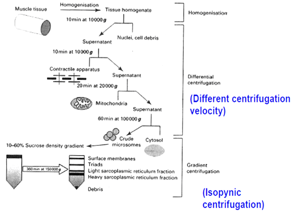 Centrifugation is a process of separation (or concentration) of particles from suspended medium based on their size, shape, density, viscosity of the medium, rotor speed etc. Centrifugal force is a key in this technique to separate the particles in less time and it acts against gravitational force. Figure 1 gives overview of centrifugation process from muscle tissue.