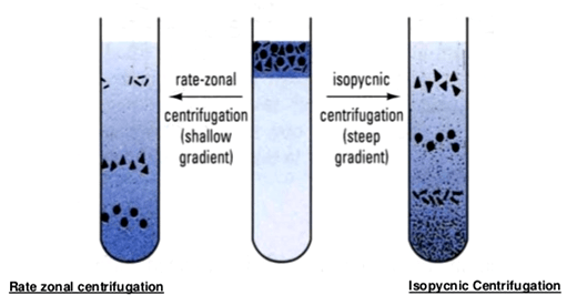 This process is also known as buoyant or equilibrium separation. In this process, particles are separated base on density. Particle size plays a role when the density of the particles and the surrounding medium is same. When the centrifugal force is applied, initially the sample and gradient gets mix uniformly and the particles move through the gradient until the density of the particles and gradient medium becomes same. Now, the gradient is called as ‘isopycnic’ and the particles get separated based on their buoyancy. Therefore, it is important to make sure that the gradient medium is always dense than the particles to be separated. Particles get separated in the gradient medium in different layers, but never settle to the bottom of the tube. Gradient medium varies depending upon the kind of material being separated. Continuous gradient method is good for analytical separation while discontinuous gradient is more suitable for biological applications (E.g.: separation of lymphocytes from blood).