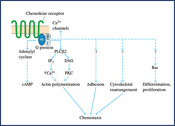 It activates heterotrimeric large G proteins when a receptor binds an appropriate chemokine, activating a signal-transduction method that generates such potent second messengers as cAMP, IP3, Ca2 +, and activated small G proteins. Chemokine-initiated activation of these signal transduction pathways carries out drastic changes. The addition of adequate chemokine to leukocytes induces sudden and widespread changes in shape within seconds, the promotion of more outstanding adhesion to endothelial walls by activating leukocyte integrins, and the development of phagocyte microbicidal oxygen radicals. These signal-transduction pathways facilitate other changes, such as granular material release, neutrophil and macrophage proteases, basophil histamine, and eosinophil cytotoxic proteins.