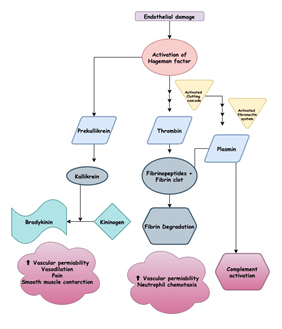 2. In order to form kallikrein, the activated Hageman factor then activates prekallikrein, which cleaves kininogen to generate bradykinin.