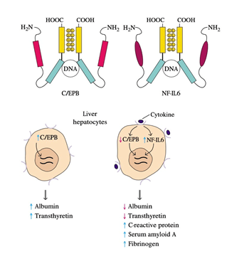 15. The inverse relationship between these two transcription factors reflects the observation that serum protein levels such as albumin and transthyretin decrease during an inflammatory response while those of acute-phase proteins increase.