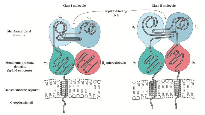 Both MHC molecules of class I and class II are membrane-bound glycoproteins closely related in both structure and function. These molecules have been isolated and purified, and x-ray crystallography has determined their extracellular domains’ three-dimensional structures. Both membrane glycoprotein types act as highly specialized antigen-presenting molecules that form extremely stable antigenic peptide complexes, displaying them on the cell surface for T cell recognition. MHC molecules of class III, on the other hand, are a group of unrelated proteins which do not share structural similarities and common function with molecules of class I and II.